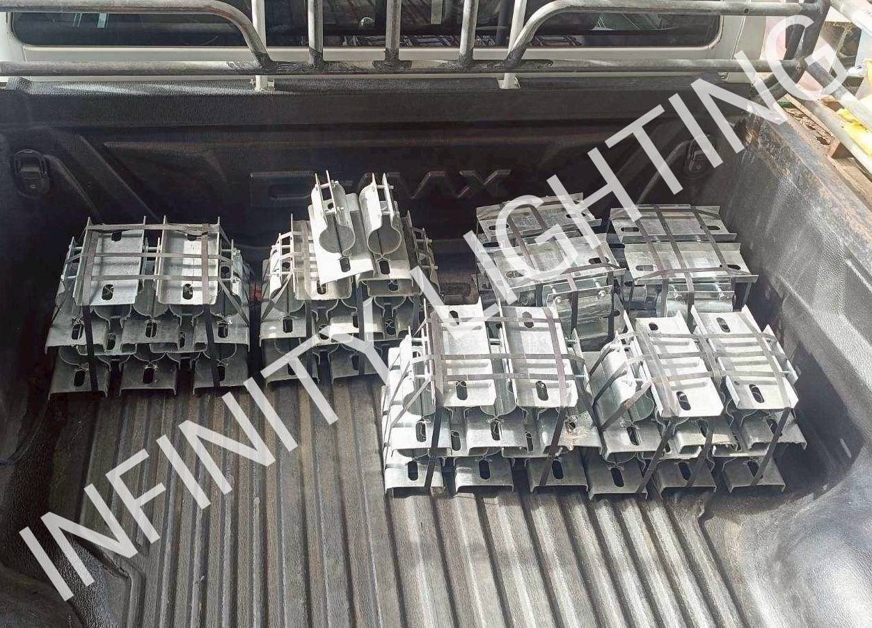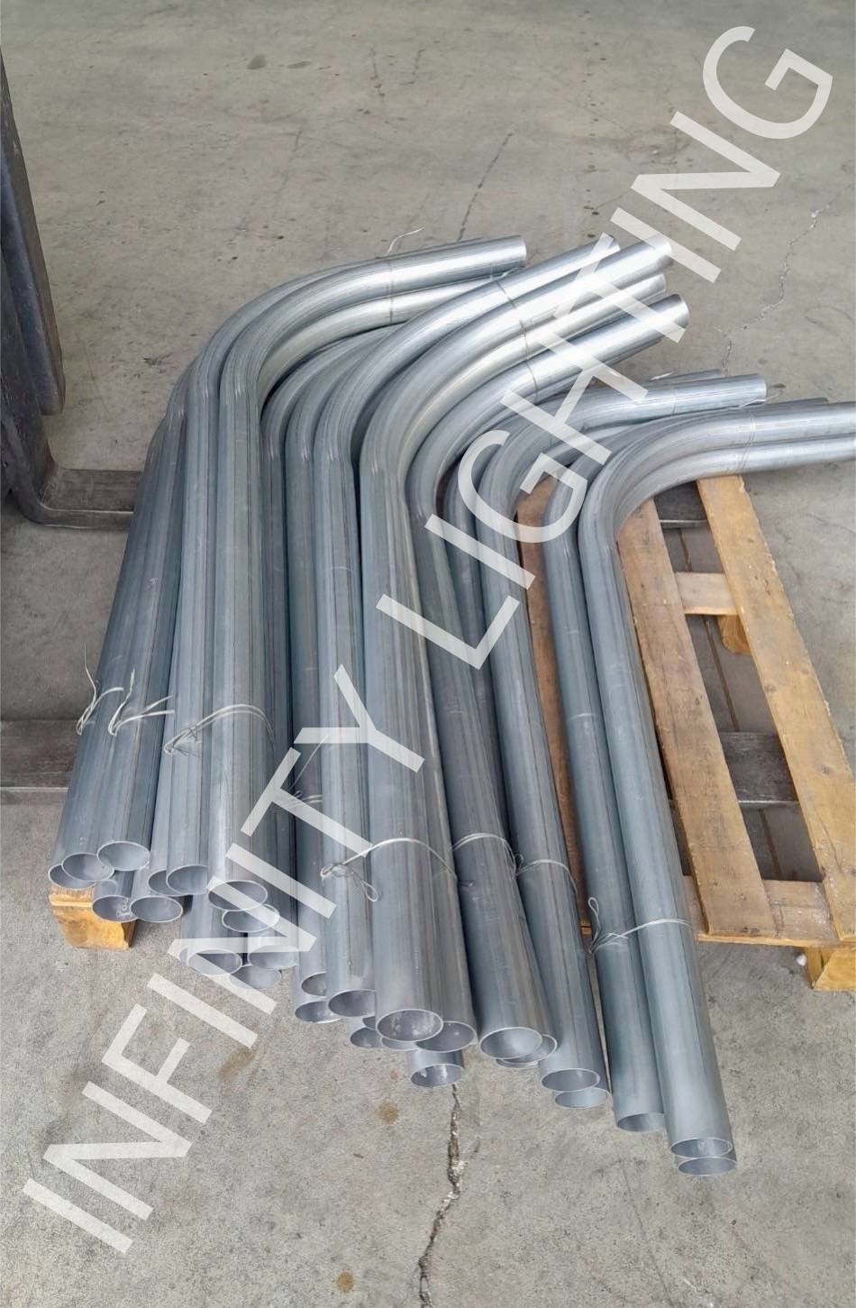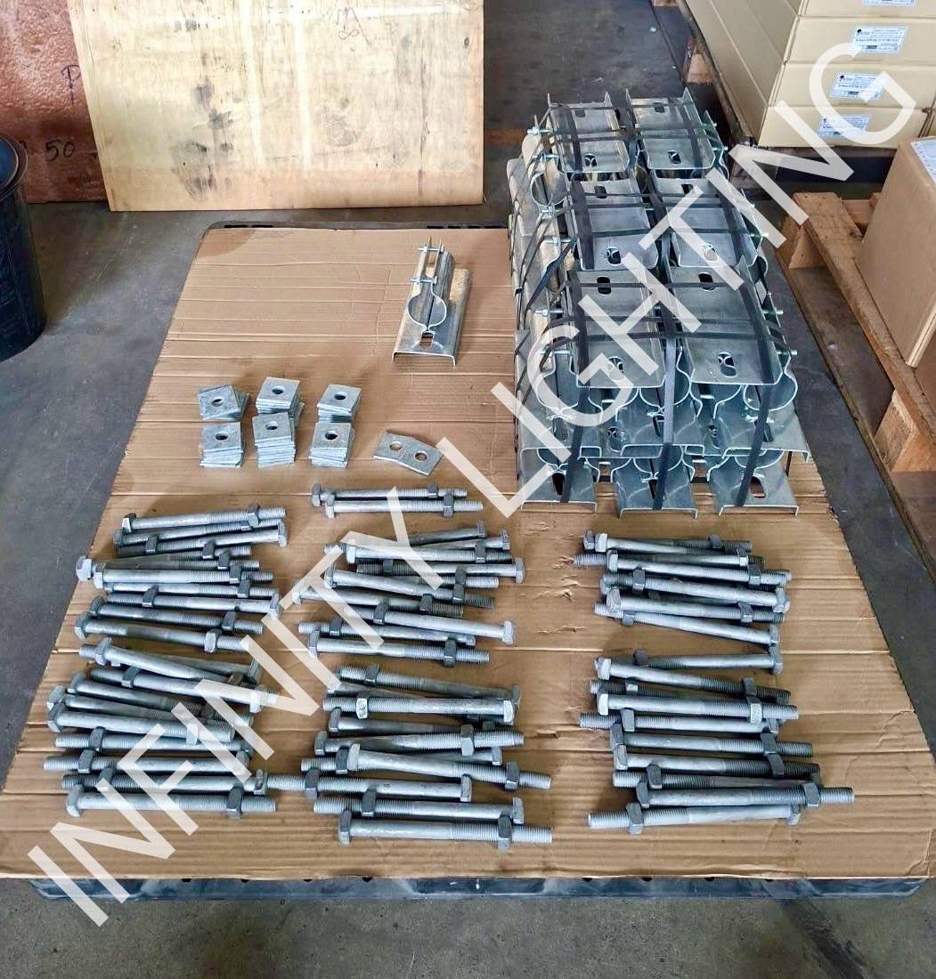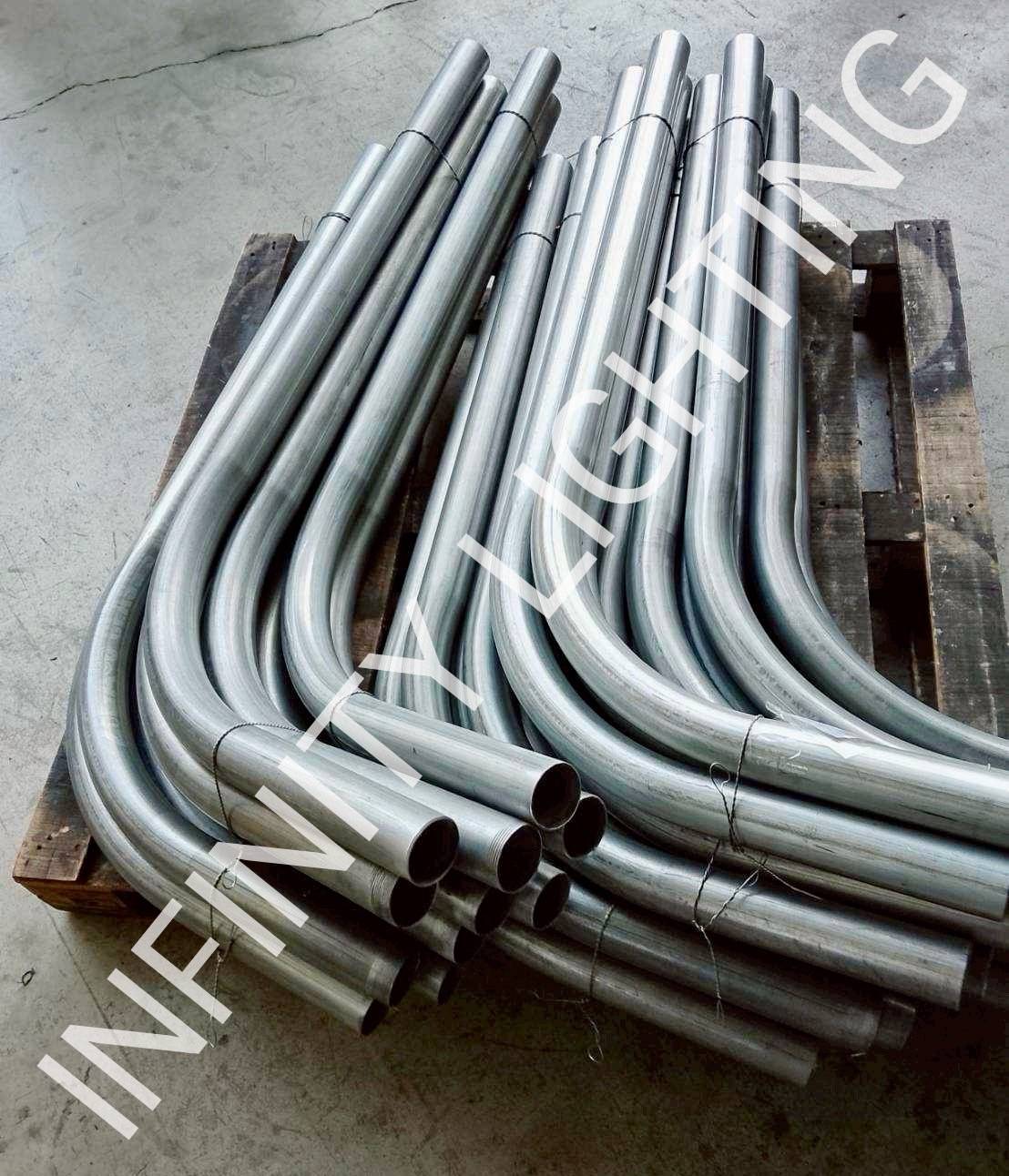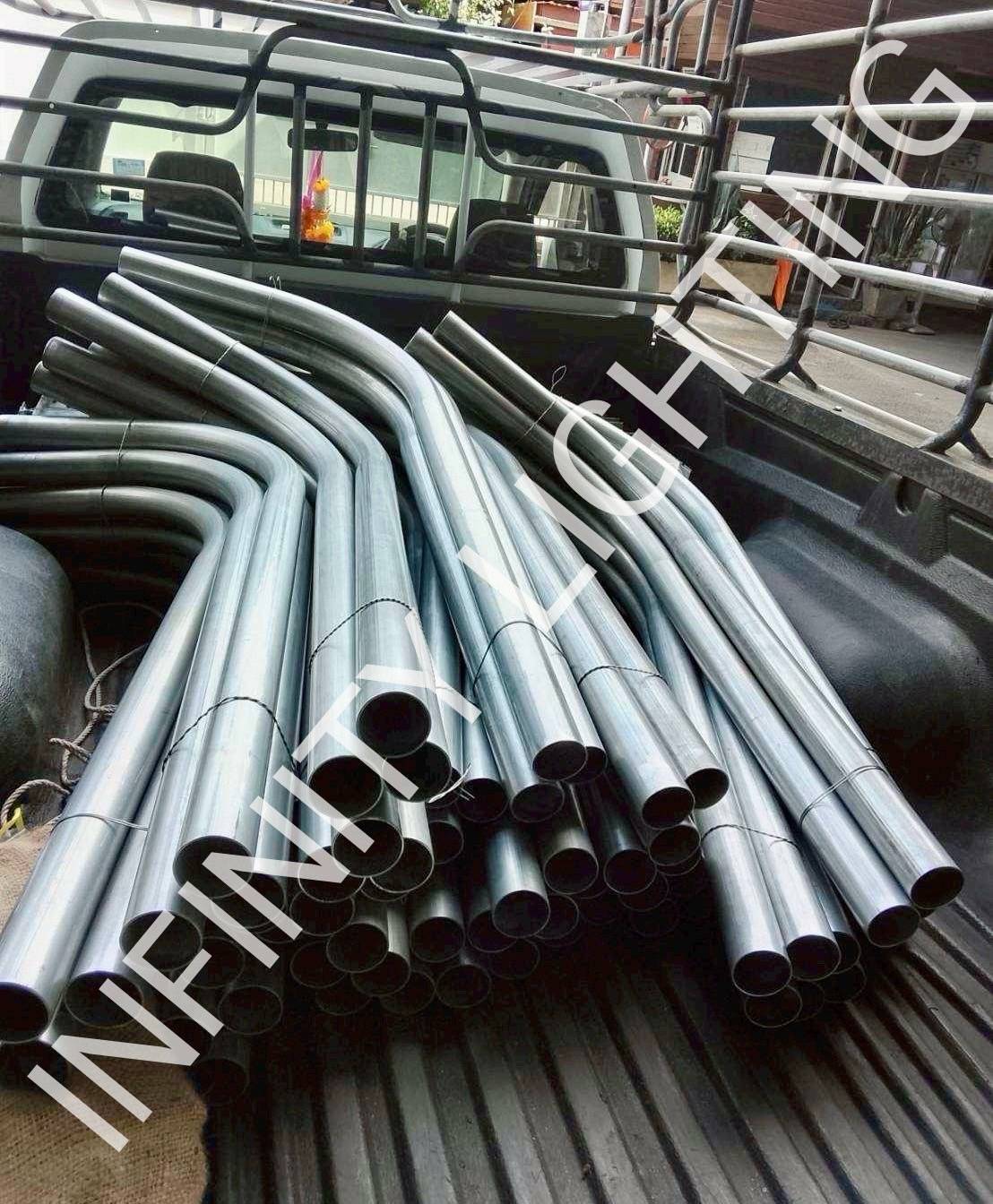 งานกิ่งโคมประปากัลวาไนซ์ 2″ ยื่น 1เมตร R300 คาดเหลือง + ขายึดตาย 2″ ชุบกัลวาไนซ์ + น็อตยึดเสาไฟฟ้า 5/8″×8″ ชุบกัลวาไนซ์