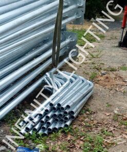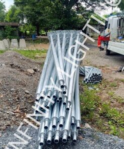 งานเสากลม 3″ สูง 6 เมตร กิ่งเดี่ยวยื่น 1 เมตร ชุบกัลวาไนซ์ พร้อมโคมถนนโซลล่าเซลล์